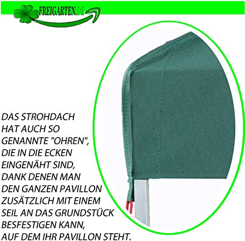 Das Dach hat ein Organisation der Klettverschlüsse, mit Hilfe von denen man das Dach auf einfache Weise an die Pavillonkonstruktion verstreben kann. Das Strohdach hat vulgo so genannte „Ohren“, die in die Ecken eingenäht sind, hinsichtlich denen man den ganzen Pavillon zusätzlich mit Hilfe von einem Seil an das Grundstück besfestigen kann, auf dem Ihr Pavillon steht. Die Strohdachecken sind befestigt mit Hilfe von der zusätzlichen Materialschicht, was eine größere Lebensdauer an den Stellen garantiert, die der Abnutzung am meisten ausges