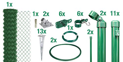 Lieferumfang: 1x Maschendraht-Beschaffenheit – 11x Zaunpfosten – 2x Unterfangen – 6x Drahtspanner – 1x Abspanndraht – 1x Bindedraht – 2x Geflechtspannstab – 6x Schellen – 13x Bodenhülse – 2x Strebenplatte – 1x Einschlag-Werkzeug