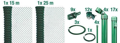 Lieferumfang: 1x Maschendraht-Anweisung 25 m – 1x Maschendraht-Anweisung 15 m – 17x Zaunpfosten – 4x Ansinnen – 9x Drahtspanner – 3x Abspanndraht – 1x Bindedraht – 4x Geflechtspannstäbe – 12x Schellen