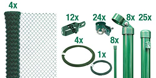 Lieferumfang: 4x Maschendraht-Befehl – 25x Zaunpfosten – 8x Projekt – 12x Drahtspanner – 4x Abspanndraht – 1x Bindedraht – 8x Geflechtspannstäbe – 24x Schellen