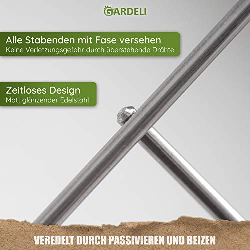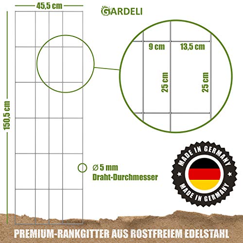 ✅ MADE IN GERMANY: Das Rankgitter von GARDELI wird aus hochwertigem rostfreiem Edelstahl 1.4301 (V2A, AISI 304) gefertigt. Direkt nach der Herstellung werden die Edelstahlspaliere gebeizt und passiviert. Durch diese Veredelungstechniken sind die Gitter besonders korrosionsbeständig.