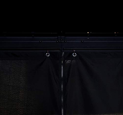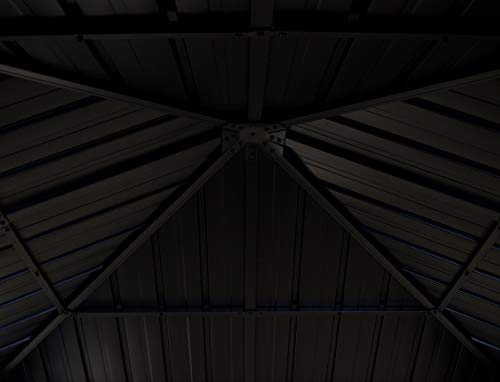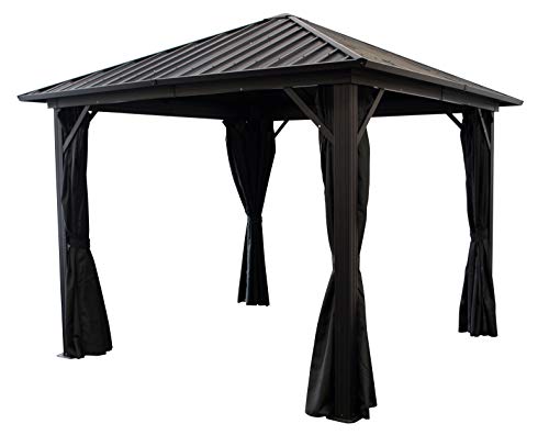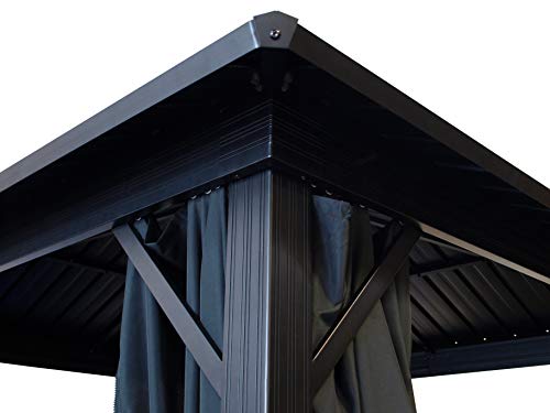 Das stabile Gestell (Maße Standpfosten = 100x100mm) ist schwarz pulverbeschichtet, die Dachplatten nicht mehr da verzinktem Metall sind ebenfalls schwarz pulverbeschichtet. Im Gegensatz zu Pavillons mit Stoffdach gibt es bei diesem Pavillon keine Probleme mit gerissenen Bespannungen oder Wasserblasen im Dach.