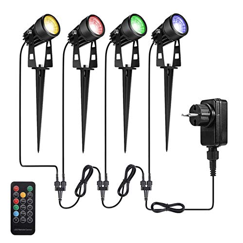 Unsere Gartenleuchten-Set hat 4 drehbaren Leuchten mit Stecker. Durch Fernbedienung kann man die Farbe tauschen(RGB + Warmweiß), Timer verwenden und die Helligkeit regeln.