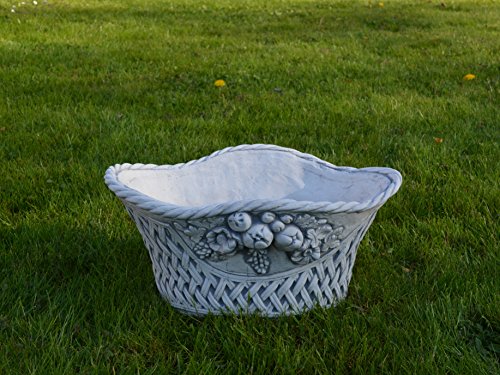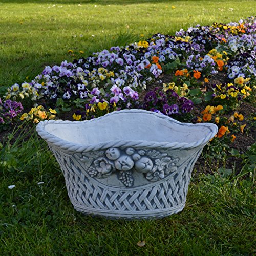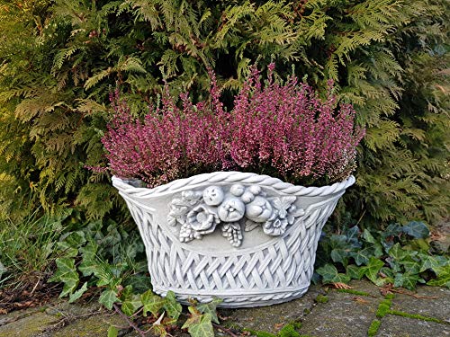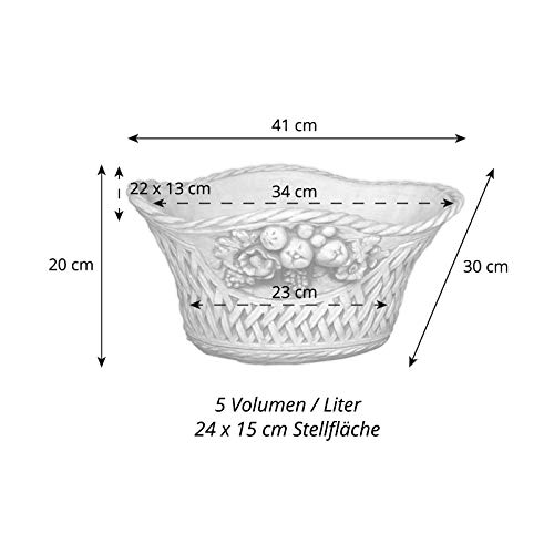 Größe: 20 cm, Länge: 41, Stellfläche: 24 x 15 cm, Fassungsvermögen: 5 Liter, Farbe: Vorsintflutlich, Gewicht: 9 kg, Werkstoff: Weißbeton / Steinguss.