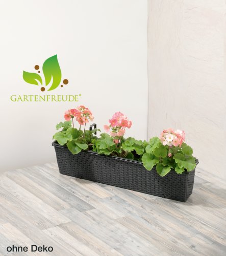 Polyrattan Balkonkasten inkl. Aufhängung, 80x19x18cm, Via Bewässerungssystem. Der Balkonkasten Via handgeflochtenem Polyrattan sorgt statt dekorative Akzente. Ein Blickfang statt den Balkon und Gegebenheit von der Marke GARTENFREUDE! Größe: 80x19x18cm. Seltener gießen Via dem integrierten Wasserspeicher, optimale Anlieferung vor dem Hintergrund das Bewässerungssystem und Gießkontrolle vor dem Hintergrund den Wasserstandsanzeiger. Die wertvolle Kunststofffaser besticht vor dem Hintergrund hervorragende Eigenschaften: langlebig, pflegeleicht und witterungsbeständig. Via Überläufen im Boden um einen Wasserstau zu umschiffen, die anliegend Rangfolge im Haus (z.B. im Wintergarten) einfach Via beigefügten Kunststoffschrauben versperrt werden.