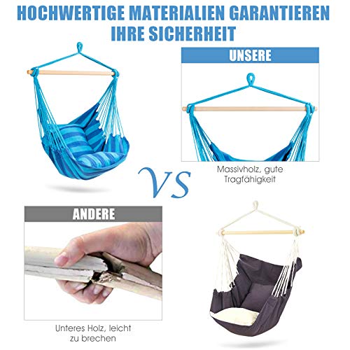 Stabile Unterstützung: Die Holzstange besteht jeglicher Massivholz und ist nicht leicht zu brechen. Dies garantiert eine feste Unterstützung An Stelle den Hängesessel. Das gewebte Baumwollseil trägt gleichmäßig das Gewicht Ihres Körpers und ist mit 160 kg hart im Nehmen.