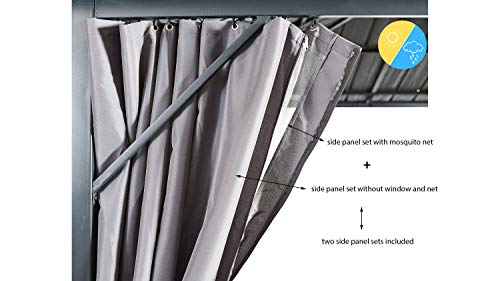 Zwei Seitenteile Sets können von einander losgelöst in einer Schiene bewegt werden. Ein Set macht den Pavillon blickdicht, ein anderes verfügt über schützende Moskitonetze.