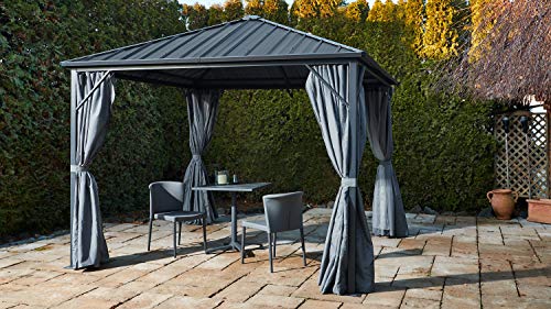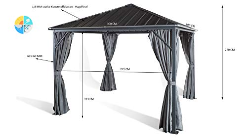 Wetterlagen als Hagel, Schnee, Regen und Sonnenstrahlen hält der Pavillon ohne Probleme stand. Ein alleinig stabiles Gestell und alleinig dicke Dachplatten machen ihn zu einem außerordentlich stabilen Allwetter Pavillon.