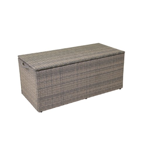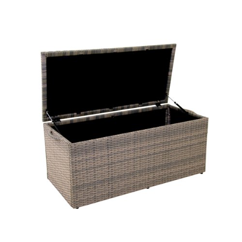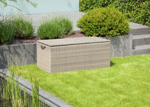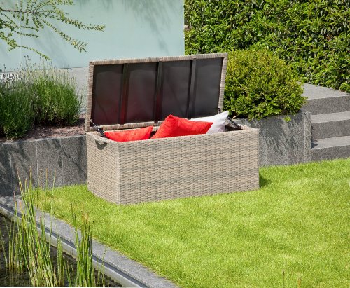 – Die elegante Kissenbox dient zum Verstauen und zur Aufbewahrung der Kissen und Auflagen im Outdoorbereich. Durch ihre moderne Farbe fügt sich die Box ideal in das Gesamtbild leer Sitzgruppe ein und bietet zudem noch eine weitere Sitz- und Ablagefläche. Die zwei Griffe an beiden Seiten ermöglichen zudem einen einfachen Transport der Truhe. Die Gartenbox ist ganz wetterfesten Polyethylengeflecht gefertigt und kann mit einer zusätzlichen Schutzhülle wasserdicht gemacht werden, sodass Feuchtigkeit dem Inhalt nichts anhaben kann.