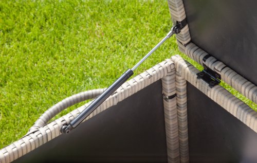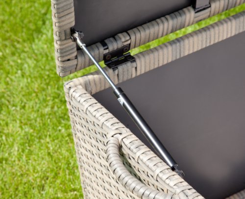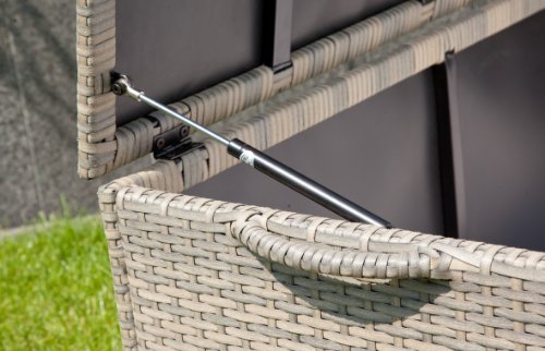 Die Rattan-Auflagenbox ist ganz schützendem und wetterfesten Polyethylengeflecht gefertigt und lässt sich einfach durch zwei Gasdruckfedern öffnen