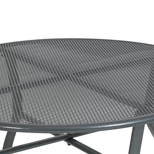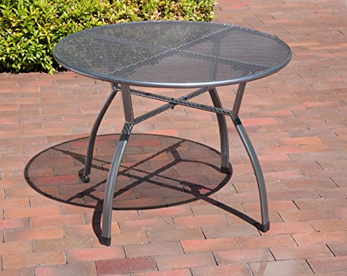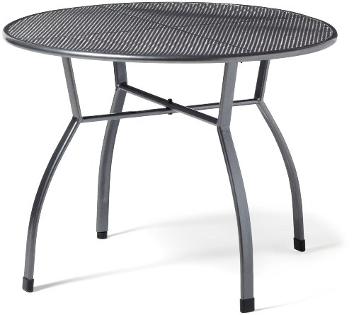 Outdoor-Tisch aus kunststoffummanteltem Stahl – mit einer runden Tischplatte in Gitteroptik und geschwungenen Beinen in Eisengrau