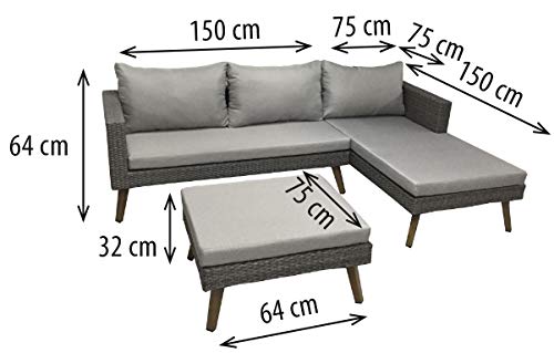Lieferumfang: 1 x Loungegruppe Gomera bestehend sämtliche 1 x Bank qua verstellbarem, integriertem Kopfteil, 1 x Bank qua zwei Sitzplätzen, 1 x Hocker/Tisch, 3 x Sitzkissen, 3 x Rückenkissen