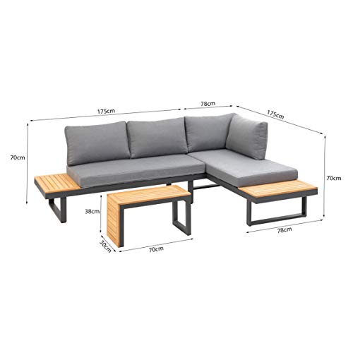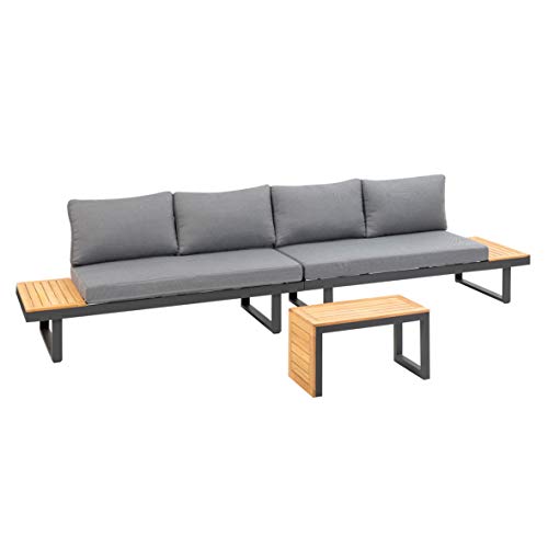Garten-Set aus Aluminium in Anthrazit Tabletts und Tischplatte aus robustem widerstandsfähigem Akazienholz FSC 100 % – ca 10 cm starke graue Kissen aus 100 % Polyester