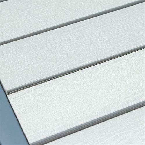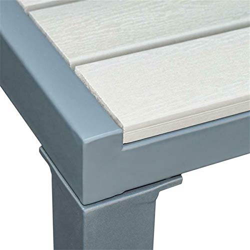 Aufgrund seines Stahlrahmens und der Leichtmetall-Füße ist der Tisch zugleich hart im Nehmen und leicht. Vulgo die Tischplatte jeder witterungs- und UV-beständigen Holzimitat-Latten ist robust und pflegeleicht.