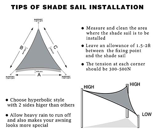 Das Sonnensegel ist mit 3 D-Ringen alle Edelstahl ausgestattet und wird mit 9 x 1,5 m langen Seilen geliefert. Sie können es einfach an den Ort anschließen, den Sie installieren möchten.