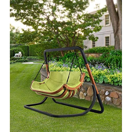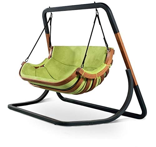 – außergewöhnlich robuste Doppelschaukel, welche ein glückseliges Lächeln auf den Gesichtern der Benutzer erzeugt – die einzigartige Ordnung des Doppelsitzes vermittelt ein fantastisches Stimmungslage von Komfort und Entspannung – Kissenfarbe: grün (100% Velours) – Material Sibirische Lärche – geklebt, imprägniert und geölt; pulverfarbener Stahl