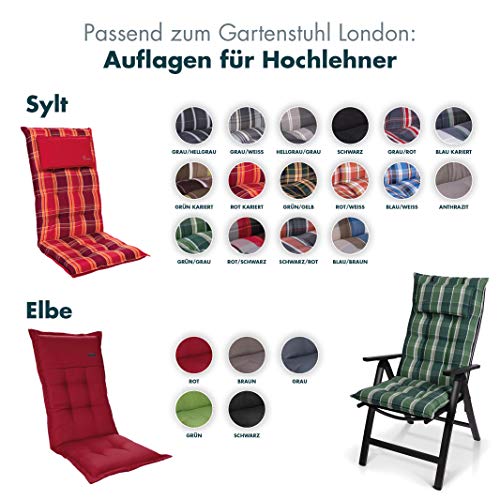 Das Klappsessel-Modell London zeichnet sich durch die hochwertige Ablauf von Leichtmetall beim Gestell und den Armlehnen aufgebraucht. Der Terrassenstuhl ist mit einer formstabilen und hochwertigen Textilbespannung ausgestattet. Qua Hersteller führt Sun Garden allesamt Produktionsschritte alleine aufgebraucht und setzt auf höchste Qualitätsstandards bei der Produktion.