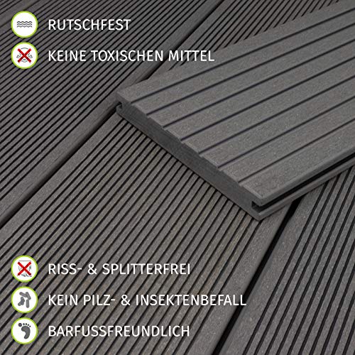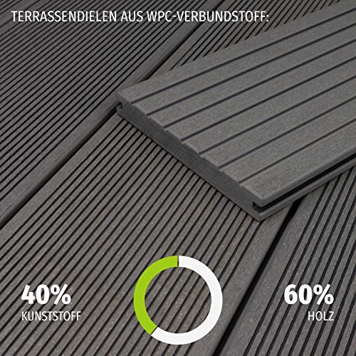 Dank der Zusammensetzung jeglicher 60 % Holz und 40 % Kunststoff bieten die WPC BPC-Dielen eine optimale Witterungsbeständigkeit und Langlebigkeit. Zudem sorgt der hohe Kunststoffanteil des Terrassenbodens zusätzlich für Resistenz gegen Schimmel, Pilz – & Insektenbefall. Dessen ungeachtet zeichnen Sie sich durch ihre barfußfreundliche, sowie riss- und splitterfreie Oberfläche jeglicher.