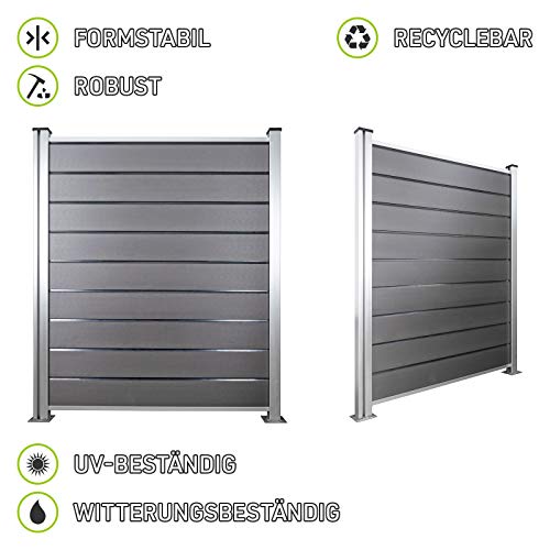 RUNDUM-SORGLOS-PAKET – WPC-Zaun Komplettset, beinhaltet: WPC-Zaunfelder, Alu-Pfosten, Pfostenkappen, Zierleisten – wahlweise über Pfosten-Konsolen zum abschrauben oder einbetonieren
