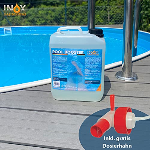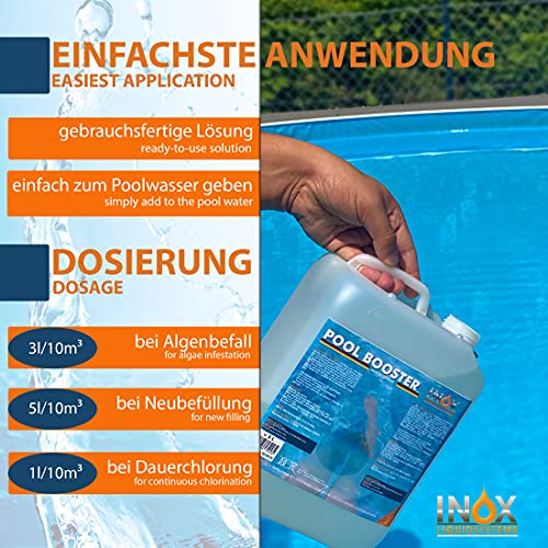 Je 10 m³ Wasserinhalt 1 l INOX Pool Booster zusammenzählen und verteilen.