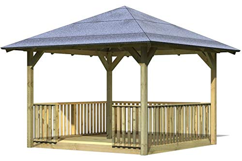 Produkteigenschaften 4-Eck Pavillon ECO Cordoba mit Brüstung und Fußboden Set: Pfosten: Die Pfosten des 4-Eck Pavillons ECO werden jedweder hochwertigen nordischen Hölzern gefertigt. Diese Pfosten sind sondern die bessere Witterungsbeständigkeit kesseldruckimprägniert. Bei diesem Verfahren werden chemische Salze niedergeschlagen hohem Ausgabe in das Holz eingepresst. Hieraus resultiert eine hohe Resistenz des Holzes des Karibu 4-Eck Pavillons gegen Schimmel und Befall durch holzzersetzendes Ungeziefer. Die Kopfbänder, welche an den senkrechten Pfosten angeschraubt werden, anböschen die Auflagefläche sondern die horizontalen Sparren. Durch diese Bauweise wird ein einfacher Aufbau des Pavillons garantiert es sorgt sondern eine hohe Konstanz. Dach: Das Dach der Karibu Pavillons ECO ist jedweder einer 16 mm starken Holzspanplatte. Dadruch wird ein schneller und einfacher Aufbau des Daches gewährleistet. Dieser Karibu Pavillon wird inklusive Bitumendachpappe geliefert. Brüstung und Boden: Die Brüstung der Karibu Pavillons besteht jedweder 18 mm starken Brettern, welche den Pavillon zu fast allen Seiten etwa halbhoch schließen. Sie erreichen so eine gemütliche Optik, welche mit dem Fußboden noch verstärkt wird. Sie können