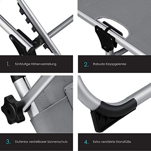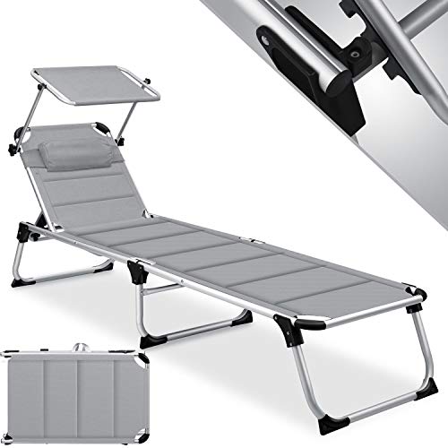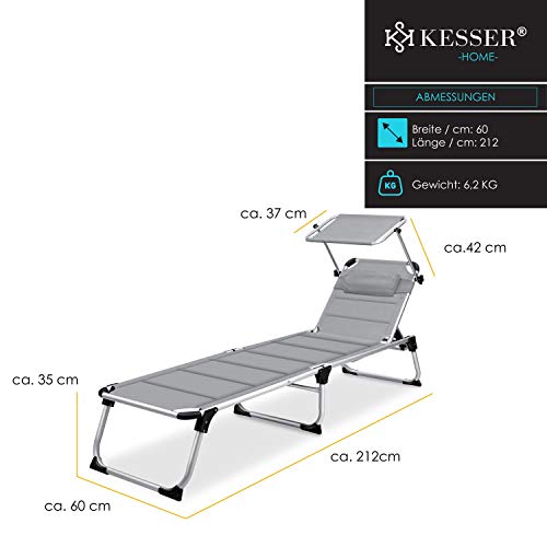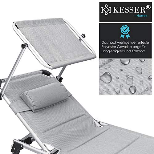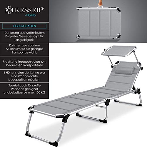 KESSER® Sonnenliege Sun mit Dach Gartenliege Liegestuhl klappbar Sonnendach Verstellbarer Rückenlehne, ergonomisch, gepolsterter Liegefläche, Aluminium Liege Gartenstuhl tragbar Strandliege, Grau