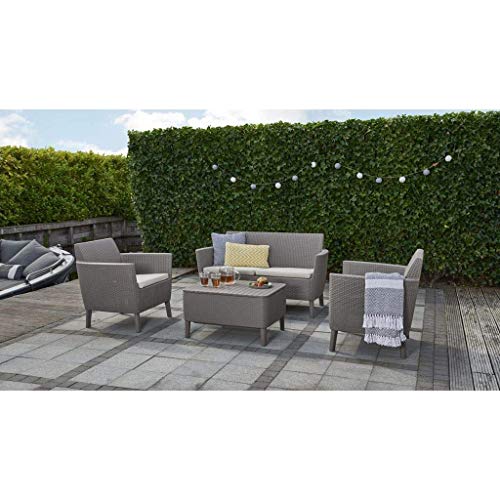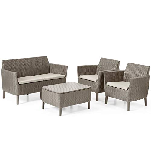 Set gegenwärtig aufgebraucht einem 2-Sitzer-Ottomane, zwei Sesseln u. a. einem Ablagetisch. Skandinavisch inspiriertes Formgebung Rattangewebe inbegriffen Sitzkissen.