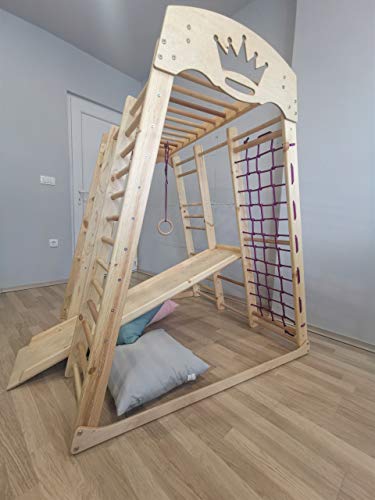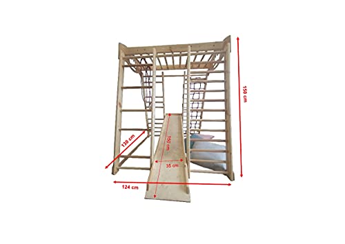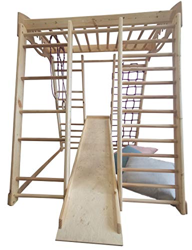 Paket beinhaltet: Sprossenwand, Kletternetz , Ringe, Kinderrutsche.