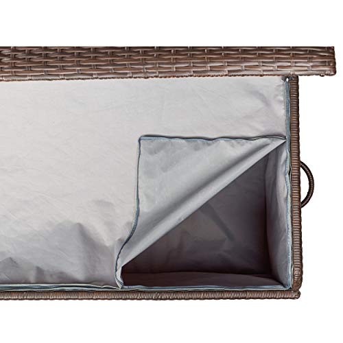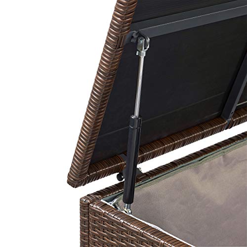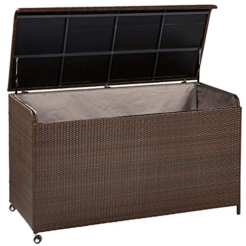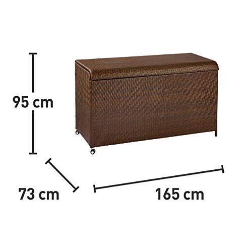 Die Kissenbox Davenport Braun XXL bietet einen großen Stauraum zur Aufbewahrung von Kissen und Polsterauflagen im Garten. Die Auflagenbox bietet einen Abschirmung vor Nässe und Sonneneinstrahlung. Aka kleinere Gartengeräte oder Grillzubehör können in der Box verstaut werden. So sorgen Sie für mehr Ordnung in Ihrem Garten und Ihre Geräte und Auflagen sind schützt.