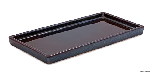 Die Außenmaße des Untersetzers sind 36x18x2,5 cm, die Stellfläche für den Topf beträgt 33×15 cm. Die Schale ist 1,3 cm abgrundtief und ist mit einem Gewicht von 1 kg und der unglasierten Unterseite sehr stand- und rutschfest.