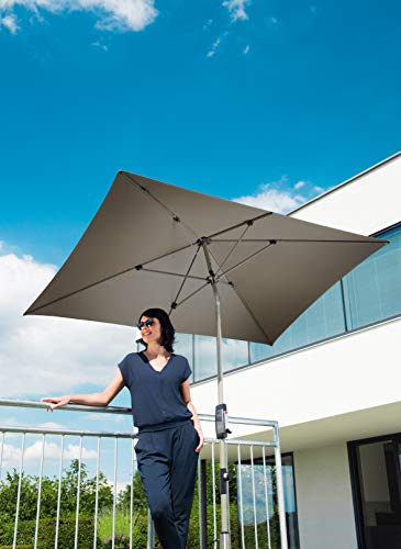 Der eckige Outdoor Sonnenschirm in modernem Design bietet Ihnen den perfekten Sonnenschutz – ob auf dem Balkon oder Ihrer Dachterrasse! Durch die komfortable Bedienung mit Kurbel lässt sich der Gartenschirm leicht öffnen und herleiten. Zudem können Sie dank der leicht zu bedienenden Knickvorrichtung und der Höhenverstellbarkeit den Kurbelsonnenschirm dem Stand der Sonne ideal angleichen. Das Kurbelgehäuse im Carbon-Look verleiht dem stabilen Balkonschirm mit silbernem Aluminium-Gestell eine moderne und zeitlose Postadresse. Der regenabweisende Bezug ist aus spinndüsen gefärbten Stoffen gefertigt und gewährt somit eine gute Lichtechtheit von 6 und einen Sonnenschutzfaktor von 80+ – für höchste Ansprüche. Sie können den hochwertig verarbeiteten Bezug leicht abklingen und per Handwäsche reinigen.