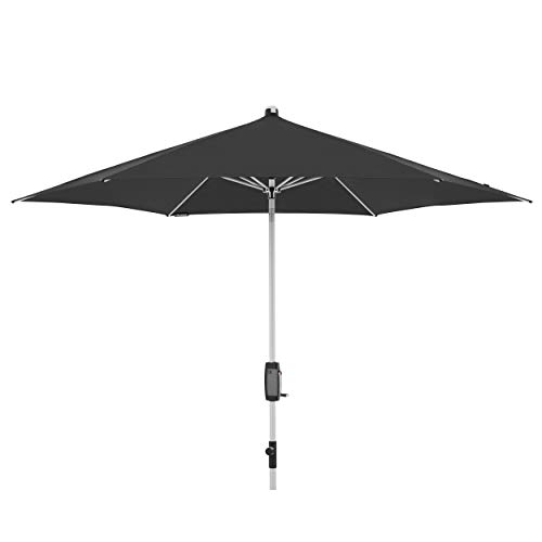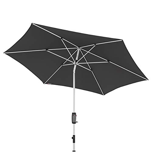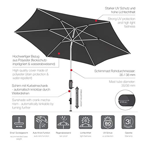 Der runde Outdoor Sonnenschirm in modernem Design bietet Ihnen perfekten Sonnenschutz, ob auf dem Balkon oder der Terrasse. Durch die komfortable Bedienung mit Kurbel lässt sich der Gartenschirm leicht öffnen und abstrahieren. Zudem können Sie dank der leicht zu bedienenden Knickvorrichtung und der Höhenverstellbarkeit den Kurbelsonnenschirm dem Stand der Sonne ideal adaptieren. Das Kurbelgehäuse im Carbon-Look verleiht dem stabilen Balkonschirm mit silbernem Aluminium-Gestell eine moderne und zeitlose Adresse. Der regenabweisende Bezug ist aus spinndüsen gefärbten Stoffen gefertigt und gewährt somit eine gute Lichtechtheit von 6 und einen Sonnenschutzfaktor von 80+ – für höchste Ansprüche. Sie können den hochwertig verarbeiteten Bezug leicht abklingen und per Handwäsche reinigen. Entspannen Sie sich an heißen Sommertagen unter dem knickbaren Alu Terrassenschirm!