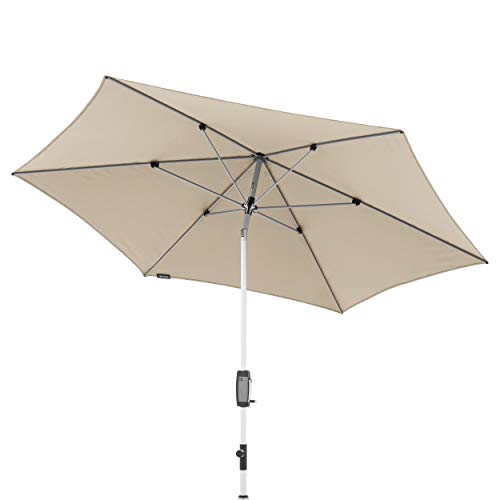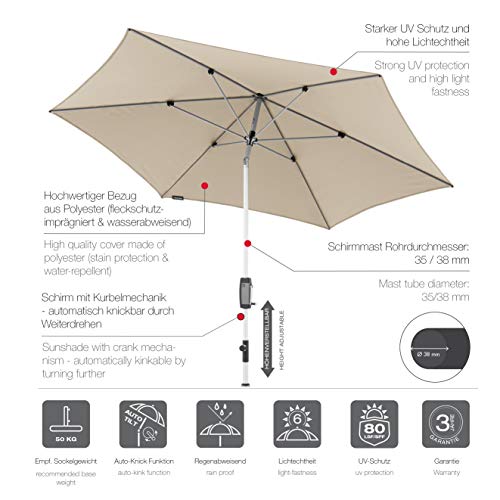 Der runde Outdoor Sonnenschirm in modernem Design bietet Ihnen perfekten Sonnenschutz, ob auf dem Balkon oder der Terrasse. Durch die komfortable Bedienung mit Kurbel lässt sich der Gartenschirm leicht öffnen und suffigieren. Zudem können Sie dank der leicht zu bedienenden Knickvorrichtung und der Höhenverstellbarkeit den Kurbelsonnenschirm dem Stand der Sonne ideal auf dieselbe Ebene stellen. Das Kurbelgehäuse im Carbon-Look verleiht dem stabilen Balkonschirm mit silbernem Aluminium-Gestell eine moderne und zeitlose Postadresse. Der regenabweisende Bezug ist aus spinndüsen gefärbten Stoffen gefertigt und gewährt somit eine gute Lichtechtheit von 6 und einen Sonnenschutzfaktor von 80+ – für höchste Ansprüche. Sie können den hochwertig verarbeiteten Bezug leicht abflauen und per Handwäsche reinigen. Entspannen Sie sich an heißen Sommertagen unter dem knickbaren Alu Terrassenschirm!