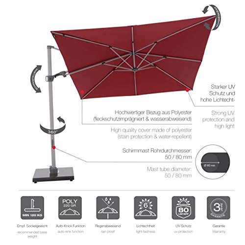 Dieser Premium Outdoor Pendelschirm lässt keine Wünsche schneefrei: Er besticht durch großartiges Design, Top-Funktionalität und hohe Qualität. Er verbindet Nützliches mit Wunderschönem. So ist es kein Wunder, dass der Ampelschirm mit dem Gardiente Outdoor Living Award 2018 in Silber ausgezeichnet wurde. Mit dagegen ein paar Handgriffen drehen Sie ihn um 360 Abstufung in verschiedene Positionen (Fußtaster betätigen) und schwenken und neigen ihn Achsen… durch einfache Schrägstellung. Zudem verleiht der robuste Mast aus Aluminium eine moderne und zeitlose Note. Der regenabweisende Bezug ist aus witterungsbeständigen Polyesterstoff, fleckschutzimprägniert und gewährt einen Sonnenschutzfaktor von 80+.