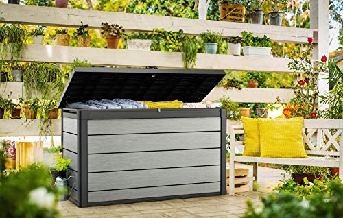 hochwertiger Kunststoff in Holzoptik Fassungsvermögen: ca. 757 Liter Außenmaße: L 146/150 x B 68/71,5 x H 91,5 cm Innenmaße: L 138 x B 61 x H 85 cm UV- & wetterbeständig Deckel mit Gasdruckfedern für leichtes Öffnen und Schlussfolgern einfacher Aufbau Inhalt bleibt trocken und wird belüftet Farbe: grau Lieferumfang