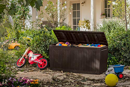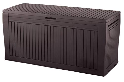 Kunststoffbox in Holzoptik Fassungsvermögen: 270 Liter bis zu 250 kg belastbar ( 2 Personen können auf dem Deckel sitzen )