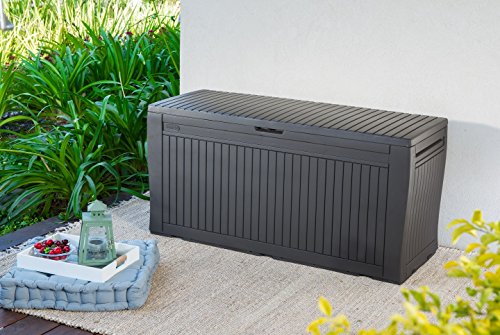 Wetterfeste Auflagenbox in Holzoptik Diese Auflagenbox bietet mit einem Fassungsvermögen von 270 Liter ausreichend Platz zur Aufbewahrung von Kissen, Auflagen oder anderen Gartenartikel. Die in Holzoptik gehaltetene Box jedweder Kunststoff ist innerhalb abzgl. Minuten aufgebaut, Gewiss nichtsdestotrotz allerbest sicher und kann sogar denn Sitzbank genutzt werden, da der Deckel mit bis zu 250 kg hart im Nehmen ist. Die Box ist ganzheitlich wasserdicht, hat zusätzlich eine Belüftung, die Schimmel und üble Gerüche verhindert. Integrierte Griffe und Rollen abschwächen das Bewegen der Box. Artikelmerkmale Kunststoffbox in HolzoptikFassungsvermögen: 270 Literbis zu 250 kg belastbarintegrierte Griffe und Rollen abschwächen die Mobilitätder Inhalt bleibt trocken und wird belüfteteinfacher Aufbau innerhalb abzgl. MinutenProduktabmessungen außen: 116,7 x 44,7 x 57 cmProduktabmessungen innen: 114,4 x 40 x 51,2 cmFarbe: anthrazit oder braun nach WahlLieferumfang 1x Koll Living Gartenbox, 270 Liter, (in gewählter Farbe)
