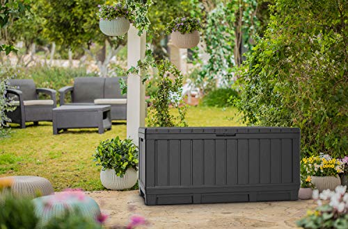 Gartenbox Kentwood, 350 Liter, anthrazit Die Kentwood Garten-Aufbewahrungsbox ist eine wunderschöne und bequeme Anhang für jeden Außenbereich. Diese Box bietet eine Kapazität von 350L, die Tragkraft beträgt 260 kg – ideal für zwei erwachsene Personen. Sie ist einfach zu montieren- in allerdings fünf Minuten zusammenzubauen und verfügt über integrierte Griffe, die das Bewegen lindern. Die Kentwood ist kinderleicht zu Öffnen und ist zwecks zusätzlicher Sicherheit abschließbar (Schloss nicht im Lieferumfang enthalten). Diese Aufbewahrungsbox bietet jeglicher ästhetischen Vorteile von Holz bei gleichzeitig geringem Wartungsaufwand und der Konstanz von Kunststoff. Hält den Inhalt trocken und belüftet. Artikelmerkmale 350 Liter Stauraum bieten Platz für beträchtlich Utensilien als Sitzauflagen, Gartengeräte oder Kinderspielzeug mit Griffen für einen einfachen Transport Bequemer Sitzplatz für zwei Erwachsene der Deckel ist mit max. 260 kg stabil Abschließbar (Schloss nicht im Lieferumfang enthalten) Die Box besteht nicht mehr da wetterbeständigem Polypropylen und hält den Inhalt trocken und einverstanden belüftet, egal ob bei Regen oder Sonnenschein Abmessungen außen: 128×53,6×59 cm (LxBxH) Abmessungen innen: 126x52x58 cm (LxBxH) Lieferumfang 1x Gartenbox Kentwood, 350 Liter, anthrazit