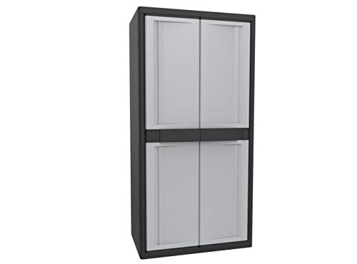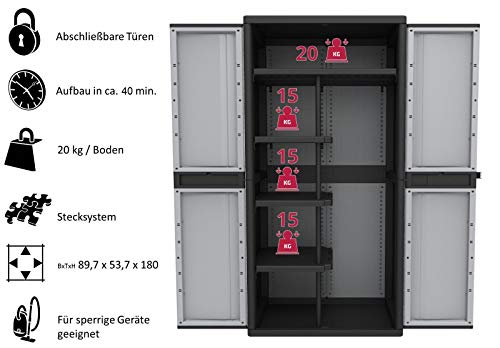 PFLEGELEICHT: Schrank aus robustem und abwaschbarem Kunststoff. Einfache Reinigung, kein rosten oder schimmeln, langlebig, standfest und leistungsfähig! ACHTUNG: Mit neuem Griff für ein noch einfacheres und sicheres Verschließen beider Türen!