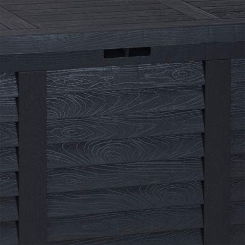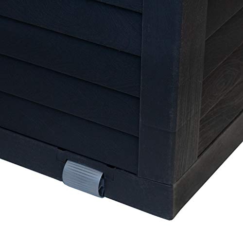 Die Aufbewahrungsbox, in Holzoptik, ist alle robustem witterungsbeständigem Kunststoff hergestellt