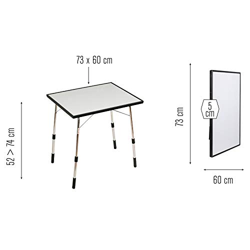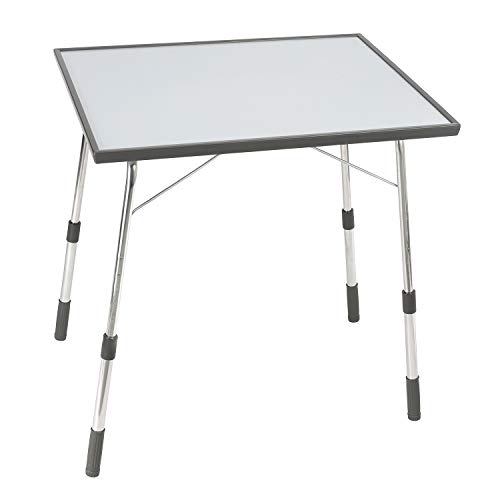 Höhenverstellbare Teleskopbeine zum opimalen Angleichen an jeden Boden mit Drehfeststellung und Sicherheitsriegel, Standfester Tisch durch massives Aluminium-Fußgestell (Ø20 mm), Einfaches Auf- und Auflösen, Schnelles Verstauen durch Klappfunktion