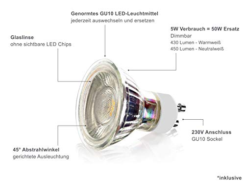 EFFIZIENTES LICHT – Inklusive tauschbarem 230V GU10 LED Leuchtmittel in 5W warmweiß 2700K (dimmbar) sondern Sicherheit und tolles Flair