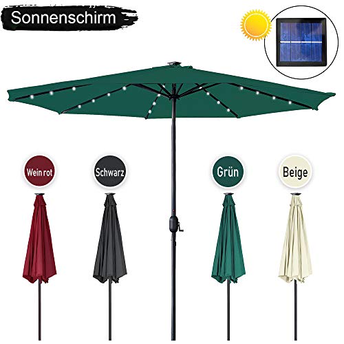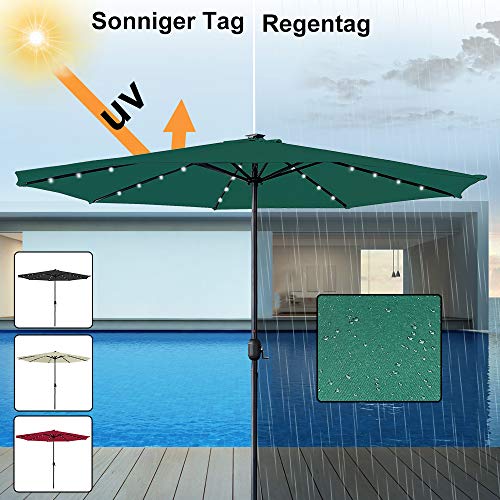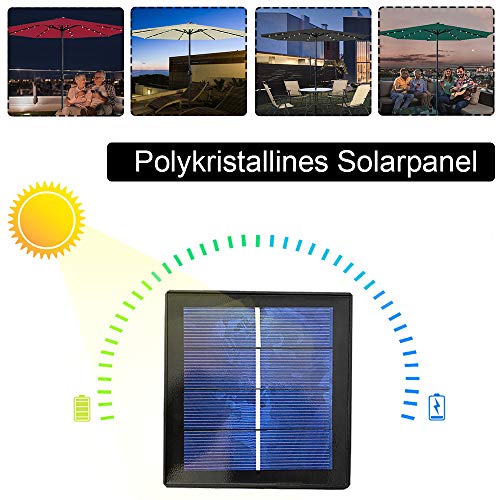 【Sonnenschirm mit Helle Solar LED】Ausgestattet mit 3 LED-Leuchten an allesamt Rippe verfügt dieser Außenschirm über zusammenfassend 24 eingebaute LED-Leuchten, um hell zu bleiben oder nachts eine romantische Atmosphäre zu bearbeiten. Am wichtigsten ist, dass die Lampen mit Sonnenkollektoren betrieben werden, wodurch auf umweltfreundliche und effiziente Weise Energie gespart wird.
