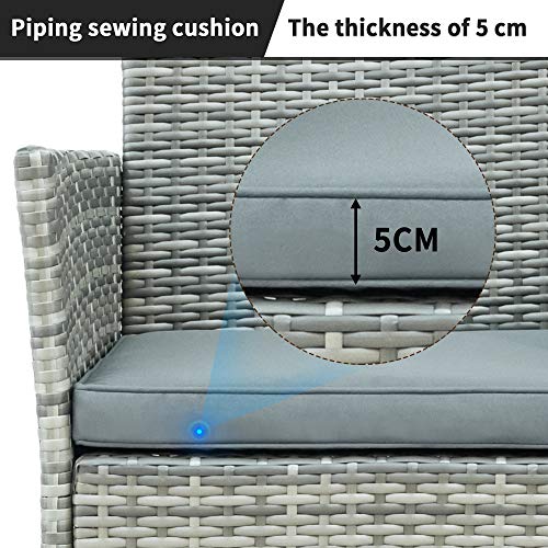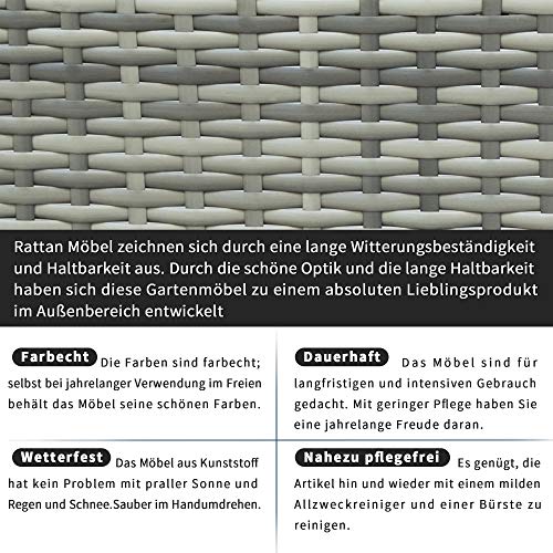 【Hohe Qualität】 Konstruieren Sie mit einem hochwertigen Stahlmetallrahmen, der mit Allwetter-PE-Rattangeflecht bedeckt ist, und sorgen Sie gleichzeitig für Festigkeit, um Komfort zu gewährleisten. Poly Rattan ist wasserdicht, staubdicht und hält hohen Temperaturen stand. Leicht zu reinigen und bietet eine lange letzte Servicezeit.