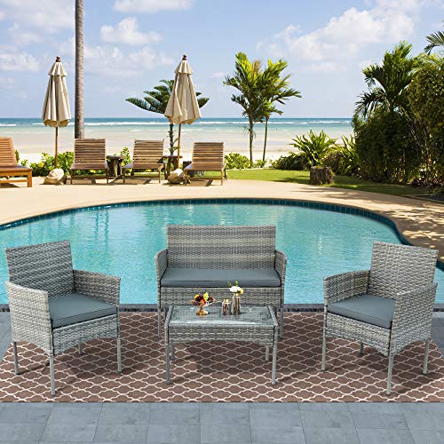 【4-teiliges Möbelset】 Das Gartenmöbel-Set enthält 2 Einzel-Sessel, 1 Doppelsofa und 1 Tisch, die mindestens für 4 Personen im Rahmen sind, um die geselligen Wochenend- und Abendstunden im Garten zu genießen. Die Tischplatte besteht ganz hochwertigem gehärtetem Glas für Getränke, Speisen und schöne Dekorationen.
