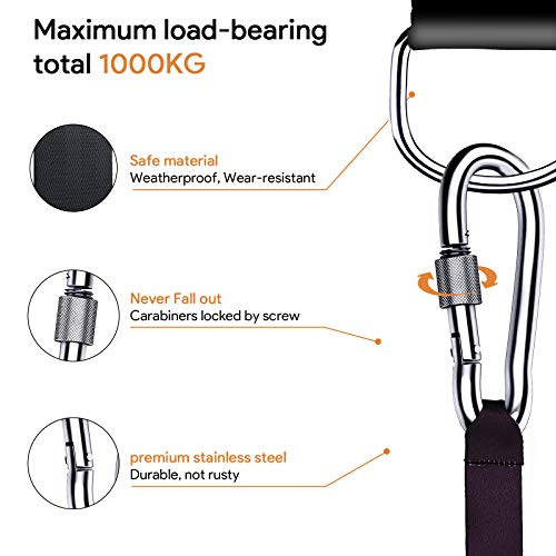 LEICHT ZU BEDIENEN: Dank des einzig langen 200cm Schaukel Aufhängung Gurt kann unser Aufhängeset einfach an Ihre gewünschte Länge und Höhe konzertiert werden. Der 8mm Karabiner ist mit einer Mutter Design. Sie können es öffnen oder hindern, indem Sie den Drehverschluss mit einer geringeren Stärke drehen.