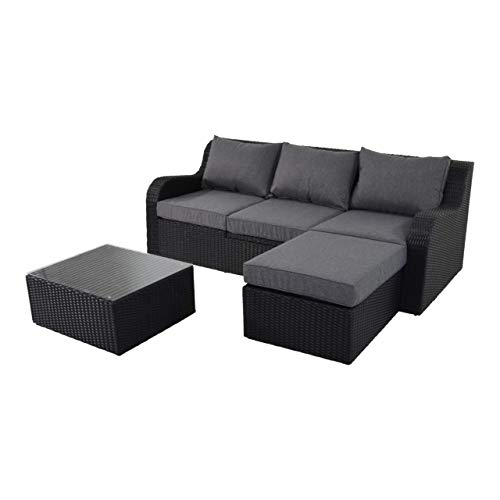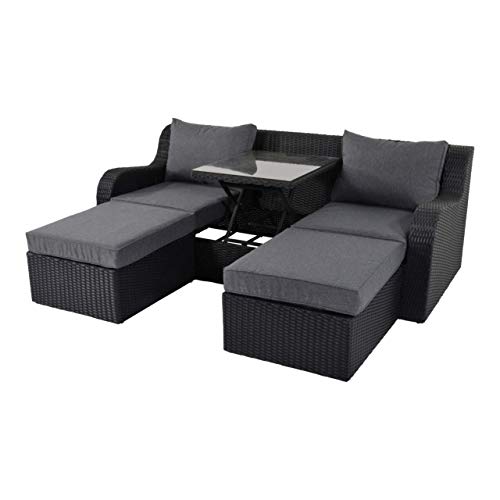 Das Multifunktions-Sofa ‚Pandora‘ vereint ein wertiges Design mit Funktionalität in vielen Variationsmöglichkeiten. Ob wie klassisches Sofa, ob wie Sonnen-Bett oder wie Abschrift-Loungeliege mit praktischem Tisch: Diese Outdoor-Lounge können Sie platzieren und veranstalten qua Sie wollen! Die mitgelieferten 4 Sitz- und 3 Nackenkissen laden unter freiem Himmel oder im Innenbereich herrlich zum Entspannen ein. Sämtliche Bezüge sind nicht mehr da Spinn-Polyester in der Farbe Grau gehalten. Die sonderlich ausgeführte Aluminium-Unterkonstruktion sorgt für Konstanz. Elegant und letzter Schrei zugleich bereichert diese Multifunktionstalent jeden Garten und jede Terrasse.