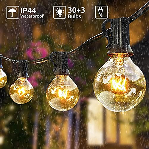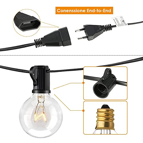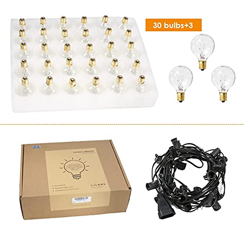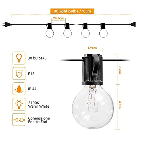 🌌【Produkt Einführung】:Lichterkette Auf einer Länge von 9,5 Metern hat 30+3 energiesparende Glühbirnen G40 E12 Sockel mit EU Strombetrieben , Entfernung zwischen den Glühbirnen: 28.6cm, Leistung: 7W pro Glühbirne. 2700K Warme weiße Lichter bringen Ihnen eine warme, weiche Atmosphäre.