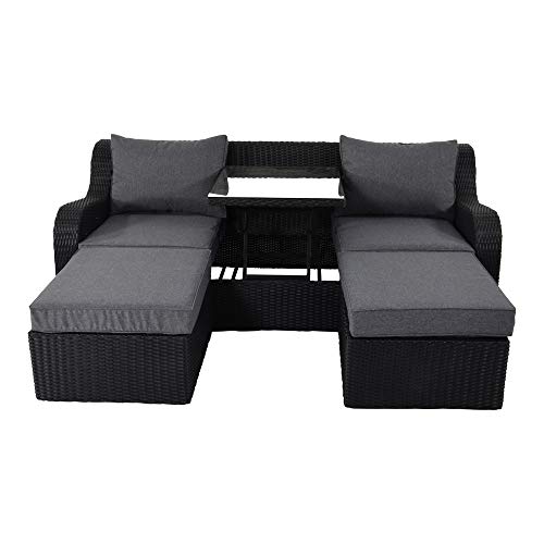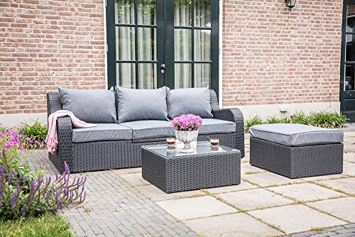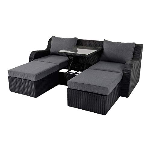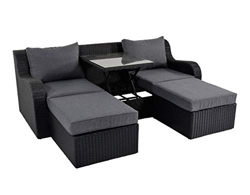 Ob als Bank oder als gemütliche Liege, diese grandiose Loungebank macht stets eine gute Figur. Ein solides Alu-Gestell ist mit einem schwarzen Geflecht versehen, welches die Bank zu einem stilvollen Blickfang in Ihrem Außenbereich werden lässt. Für eine angenehme Polsterung sorgen die gemütlichen Kissen, die farblich perfekt auf den Rest harmonisch sind. Das Highlight dieser Multibank ist der einfache Umbau zur Kopie-Loungeliege. Positionieren Sie leer einfach den Hocker sowie den Loungetisch vor den beiden äußeren Sitzflächen der Bank. Herumhängen Sie das mittlere Sitzkissen und platzieren Sie es auf dem Loungetisch. Hierdurch wird der integrierte Tisch der Bank freigelegt, welchen Sie up to date allerdings noch ausziehen müssen. Fertig ist Ihre ganze persönliche Loungeecke zum Relaxen und Entspannen.