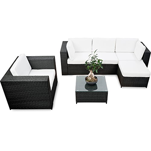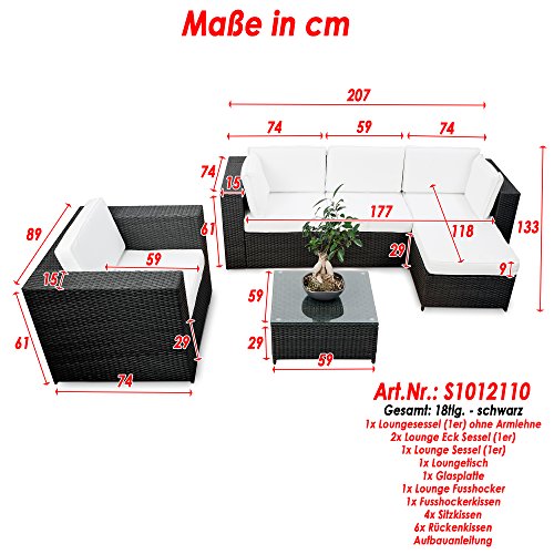 ❖ Farbe: schwarz (anhrazit) ❖ Lieferumfang: 1x 1er Loungesessel, 2x Lounge Ecksessel – Element, 1x Lounge Mittelsessel Element, 1x Polyrattan Tisch mit Sicherheitsglasplatte, 1x Lounge Hocker, alle abgebildete Auflagen